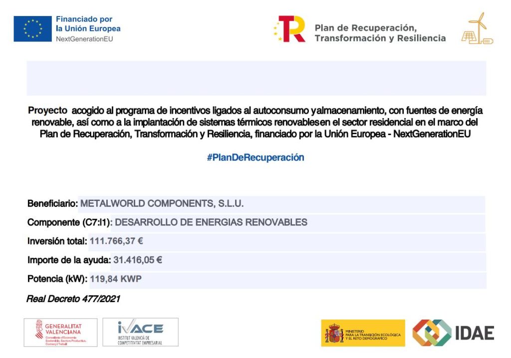 *METAWORLD COMPONETS S.L.U ha recibido una ayuda de 1600€ de la unión Europea, con cargo al fondo Next Generation UE, en el marco de recuperación del Plan de Recuperación, Trasformación y Resiliencia, para la adquisición de vehículos eléctricos “enchufables” y de pila combustible dentro del Programa de incentivos a la movilidad eficiente y sostenible (Programa MOVES III Vehículos Comunitat Valenciana) del Ministerio para la Transición Ecológica y el Reto Demográfico a través del IDAE, gestionado por el Instituto Valenciano de Competitividad Empresarial (IVACE).